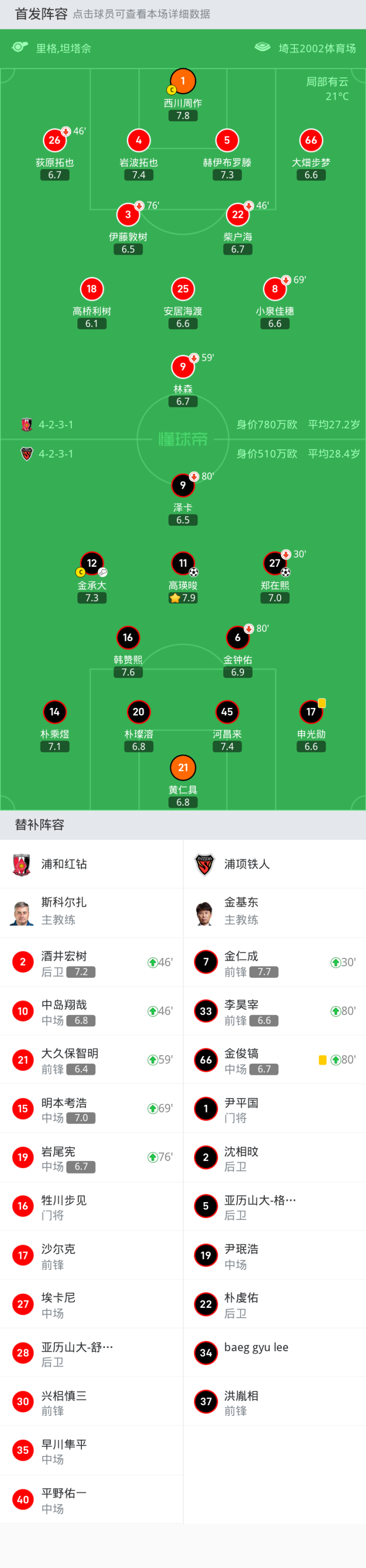 浦和红钻首发:9-林森, 1-西川周作, 5-赫伊布罗滕, 4-岩波拓也, 26-荻原拓也, 22-柴户海, 8-小泉佳穗, 66-大畑步梦, 18-高桥利树, 3-伊藤敦树, 25-安居海渡