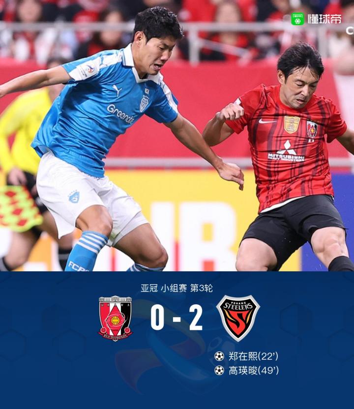 北京时间10月24日亚冠小组赛第3轮,浦和红钻主场对阵浦项铁人。比赛第22分钟,郑在熙率先破门,下半场比赛第49分钟,高瑛晙在下一城。最终比分0-2。