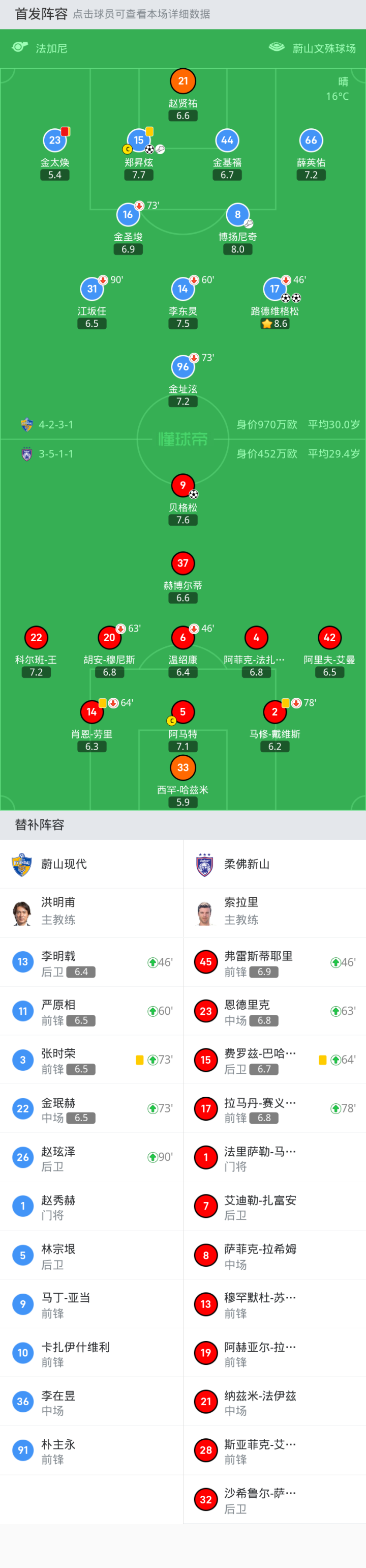 蔚山现代首发:16-金圣埈, 23-金太焕, 44-金基禧, 8-博扬尼奇, 21-赵贤祐, 31-江坂任, 15-郑昇炫, 17-路德维格松, 96-金址泫, 14-李东炅, 66-薛英佑