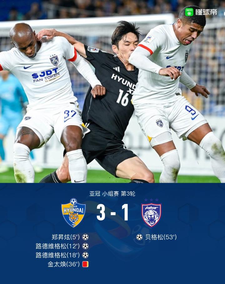 北京时间10月24日亚冠小组赛第3轮,蔚山现代主场对阵柔佛新山。比赛第5分钟,郑昇炫头球破门,比赛第12分与第18分钟,路德维格松双响,比赛第36分钟金太焕两黄变一红被罚下,下半场,比赛第53分钟,贝格松扳回一城。最终比分3-1。