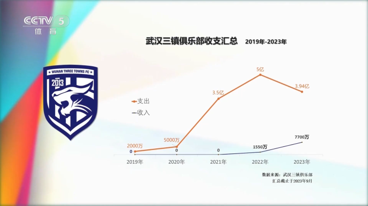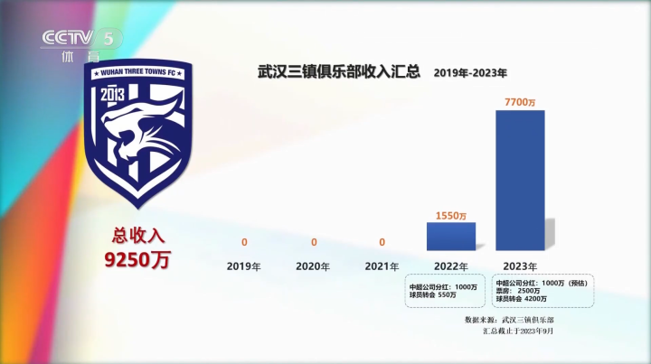 ——2023年至今,中超分红预估1,000万,票房收入2,500万,球员转会收入为4,200万,收入合计7,700万,支出为3.94亿,收支比约1:5。