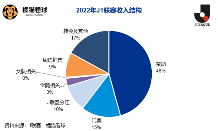 如果说欧洲五大联赛遥不可及,近邻日本或许是更容易触及的模仿对象。同样作为足球后进市场,J联赛的收入结构亦与五大联赛存在很大差异,转播权价值有限,而商业收入占比畸高。