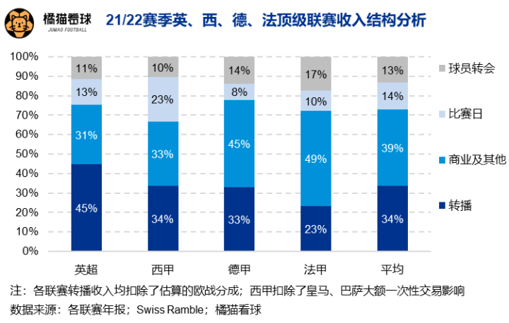 根据对英超、德甲、西甲和法甲的收入结构分析可得,欧洲顶级联赛转播(由于亚洲俱乐部洲际赛事商业价值有限,在此扣除欧战分成)、商业、比赛日和转会收入的比重分别占34%、39%、14%、13%。