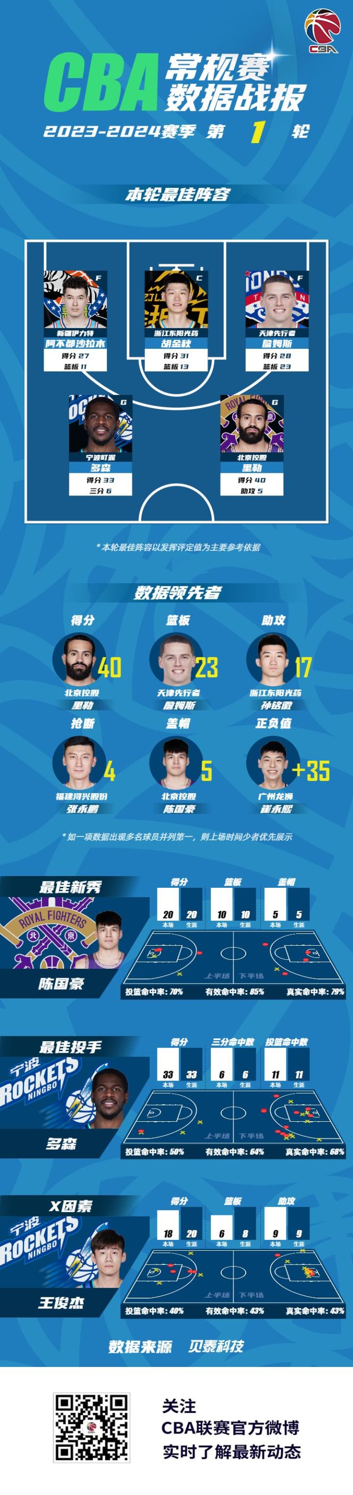 CBA官方:胡金秋和阿不都领衔首周最佳阵容,陈国豪最佳新秀