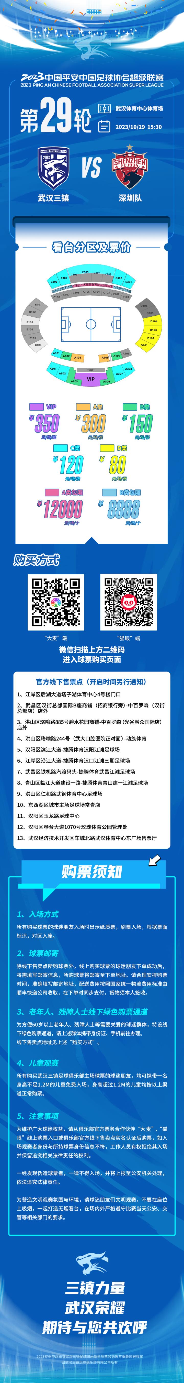 武汉三镇将在2023赛季中超联赛第29轮中主场对...武汉三镇足球俱乐部 @懂球帝2023-10-25 12:09武汉三镇将在2023赛季中超联赛第29轮中主场对阵深圳队,这也是本赛季中超三镇队的主场最终战!期待在周日午后的看台上看到大家的身影,我们一起为三镇加油! 本场比赛球票将于今日15:00开启线上发售,敬请各位球迷朋友关注,票务详情及购买方式请查看下图。 三镇力量,武汉荣耀,期待与您共欢呼!展开更多