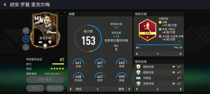 天赋方面,里克尔梅配备了艺术家,对他的加速、射门、短传、盘带、控球五项数据有所提升。花式方面,里克尔梅配备了高级油炸丸子,花式星级达到五星。