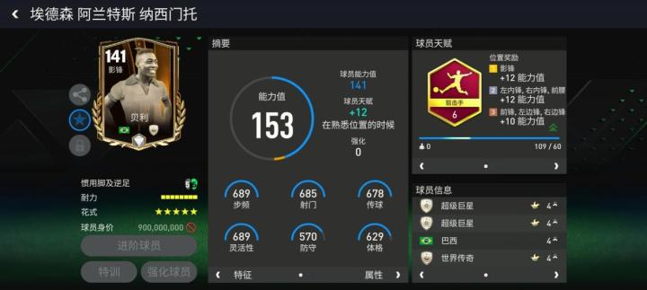 天赋方面,贝利配备了狙击手,对他的加速、射门、远射、抢点、盘带五项数据有所提升。花式方面,五星花式星级的贝利拥有马赛回旋基础花式。