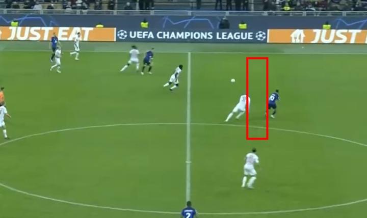 首先,后场德芙的一脚半空起高球找劳塔罗,但是在对方大老黑中卫上抢的干扰下,双方都没有实际控制到来球,皮球落地后急速向前,此时的桑切斯与对方负责跟防他的防守球员几乎处于同一条线上,在图中可以看到,红色圆圈标出两人的位置几乎是重合的。