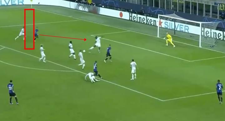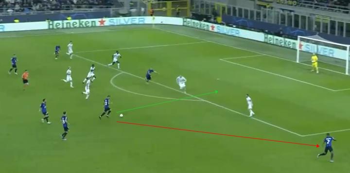 当发现劳塔罗与对应防守球员漏过皮球之后,桑切斯迅速启动,几乎在一瞬间便拉开了与防守球员的空间。