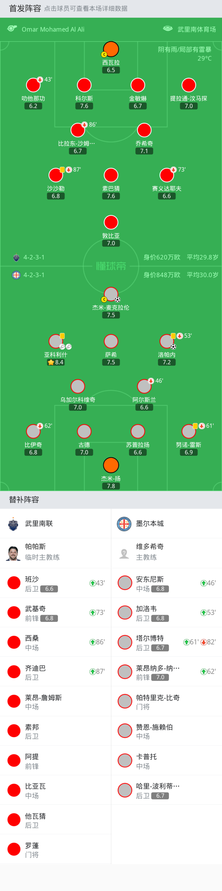 墨尔本城首发:26-苏普拉扬, 1-杰米-扬, 16-比伊奇, 10-阿尔斯兰, 4-努诺-雷斯, 22-古德, 44-亚科利什, 8-萨希, 9-杰米-麦克拉伦, 6-乌加尔科维奇, 21-洛帕内