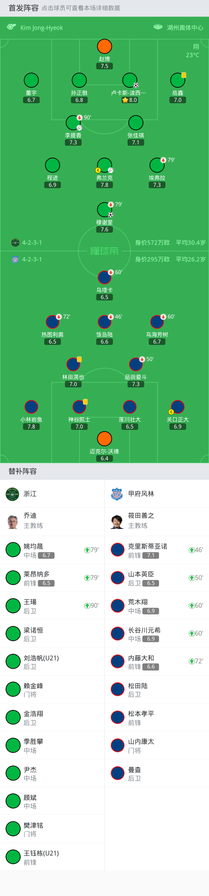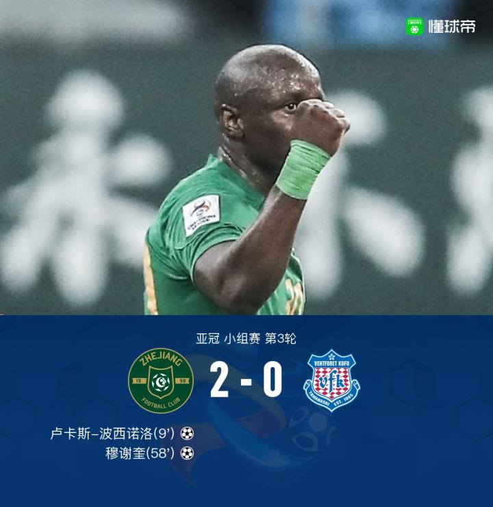 浙江2-0甲府风林,取得重回亚冠首胜,卢卡斯、穆谢奎破门