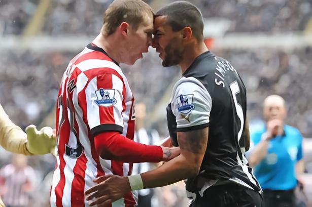 2012年,丹尼·辛普森在主场1:1战平桑德兰的比赛中与詹姆斯·麦克林对峙。