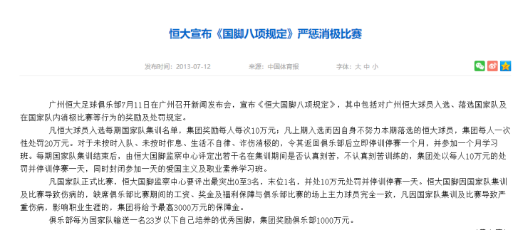 恒大也因为这场惨案成为众矢之的,外界和球迷的普遍观点是:恒大球员为了高薪,根本不会在国家队全力付出。不到一个月后,恒大出台了《国脚八项规定》。恒大官方说,许家印为此调研了数十次,开了三十几次专题会议。