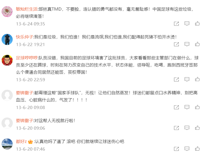 裁判吹响比赛结束哨音的那一刻,此前的倒彩完全成为了“骂娘大会”,各种对国足的辱骂纷至沓来。