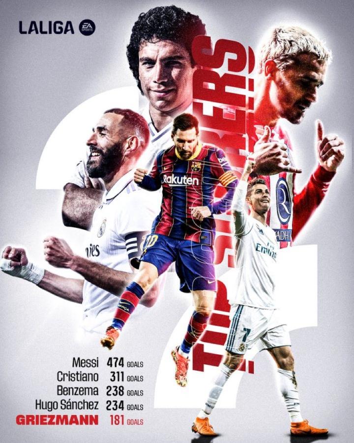 格列兹曼以181个进球进入西甲外籍球员历史进球榜...THELondonEYE @懂球帝2023-10-26 20:35格列兹曼以181个进球进入西甲外籍球员历史进球榜前5名 在他前面的分别是乌戈桑切斯(墨西哥,234球),本泽马(法国,238球),C罗(葡萄牙,311球),梅西(阿根廷,474球)。展开更多