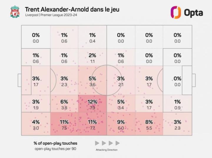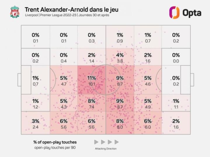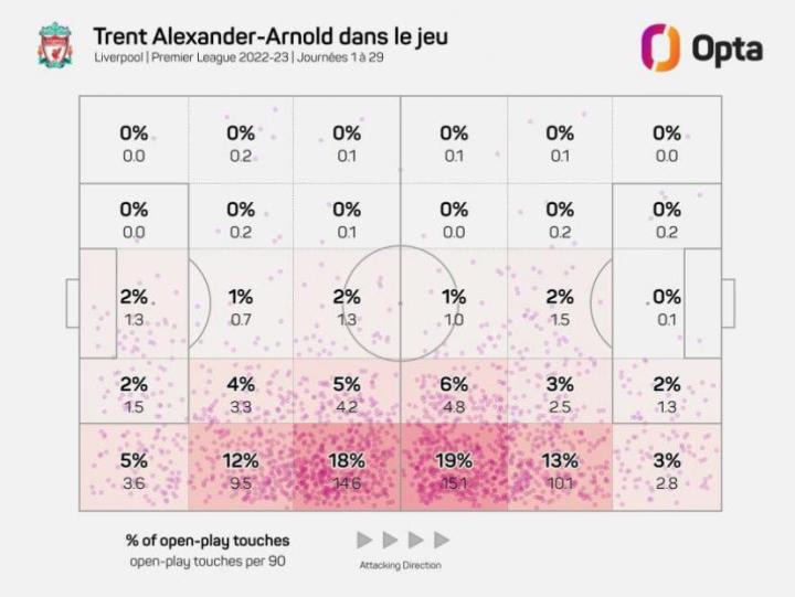 *此视图效果展示了阿诺德上赛季直到第29轮在比赛中触球的情况,尽管他经常内切,但这位边后卫大部分时间都在边线附近踢球。