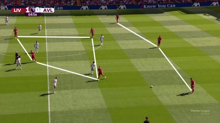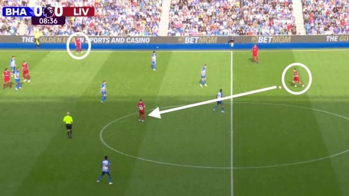 *在中路持球,阿诺德给麦卡利斯特送出精准传球,而布莱顿的几名球员则是在观察是否有机可乘。在上半场,中场球员埃利奥特在右侧提供了宽度。