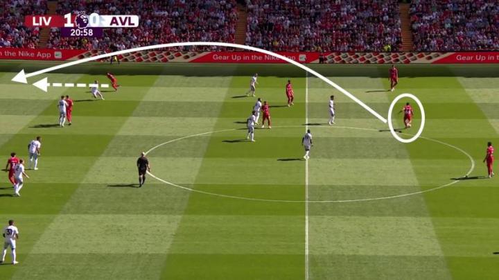 *阿诺德凭借一脚漂亮的传球,利用阿斯顿维拉防线的高位,从相当靠后的位置纵深传给萨拉赫,最终造成进球。
