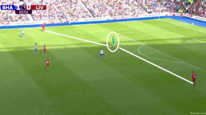 *阿利松在夺回球权后在中卫位置寻找出球空间,马蒂普移至右侧,范戴克移至左侧。