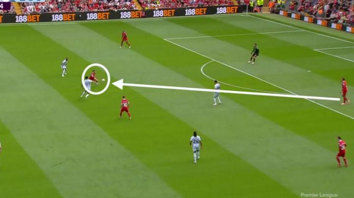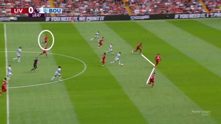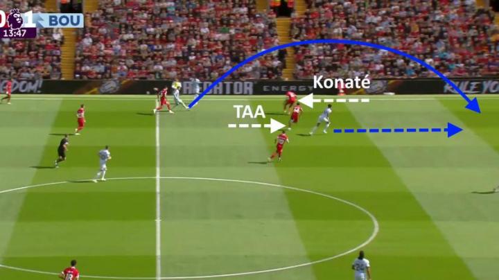 *索博斯洛伊在距离中场线不远的位置丢球,在攻防转换中,科纳特像往常一样强势前压,而阿诺德则试图从中路位置回撤,伯恩茅斯利用这个时间差从利物浦右路发动进攻。