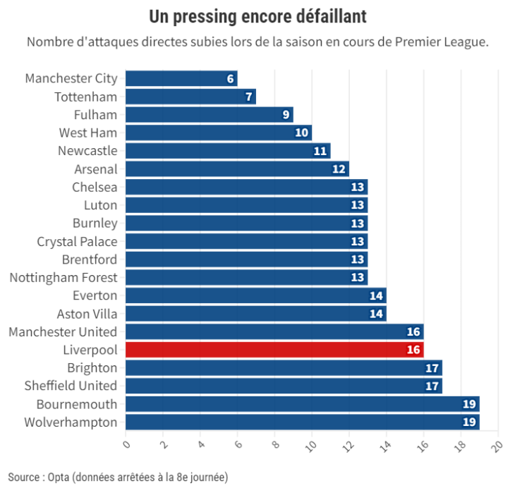足球界没有奇迹的解决方案,近几个月采取的战术所建立的优势,也让利物浦产生了其他弱点。红军最近的攻防转换已经很脆弱,但他们的处境并未得到改善。利物浦也很难阻止对手的直接进攻,因为他们的压迫有时缺乏效率。