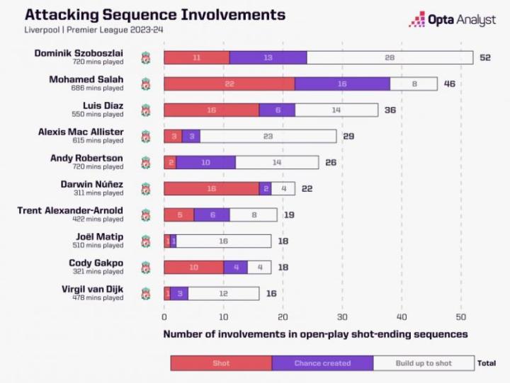 *索博斯洛伊是本赛季开始以来,在英超参与利物浦进攻最多的球员。我们注意到,上赛季在该领域排名第2的阿诺德排名有所下降。