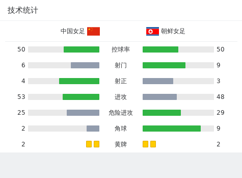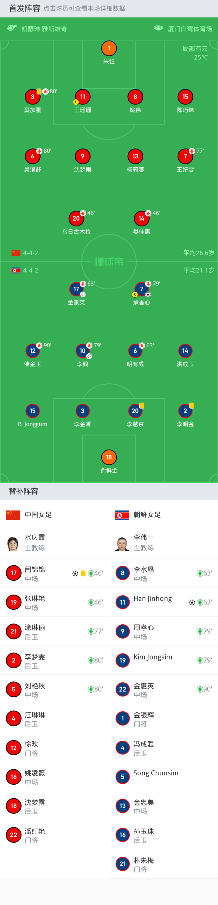 上场替补:79'9-周孝心, 63'8-李水晶, 90'+622-金惠英, 63'11-韩金红, 79'19-金正心