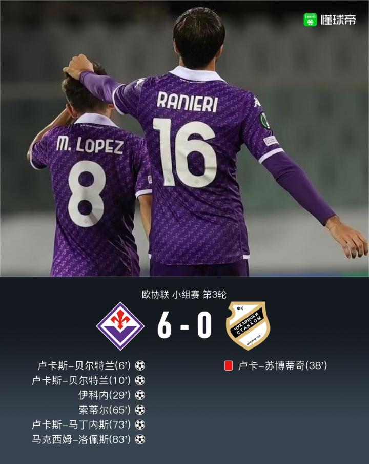 北京时间10月27日欧协联 小组赛 第3轮,佛罗伦萨主场对阵古拉瑞奇。开场6分钟贝尔特兰率先破门,仅仅过了4分钟后贝尔特兰再进一球完成梅开二度。第29分钟伊科内再下一成。第38分钟卢卡-苏博蒂奇铲球犯规,回看VAR后改判红牌直接罚下。易边再战,索蒂尔任意球直接破门。索蒂尔边路传中,马丁内斯门前捅射破门。最后阶段洛佩斯远射破门。最终佛罗伦萨主场6-0大胜客战的古拉瑞奇。