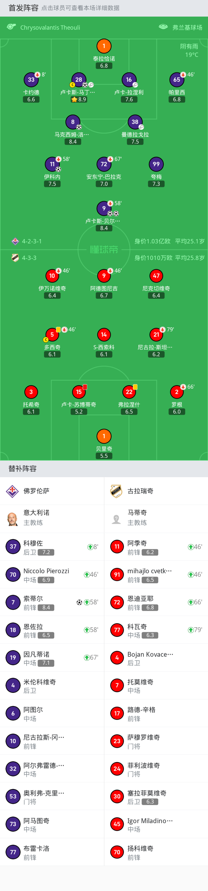 佛罗伦萨首发:1-泰拉恰诺, 72-安东宁-巴拉克, 8-马克西姆-洛佩斯, 38-曼德拉戈拉, 11-伊科内, 28-卢卡斯-马丁内斯, 99-夸梅, 16-卢卡-拉涅利, 9-卢卡斯-贝尔特兰, 65-帕里西, 33-卡约德