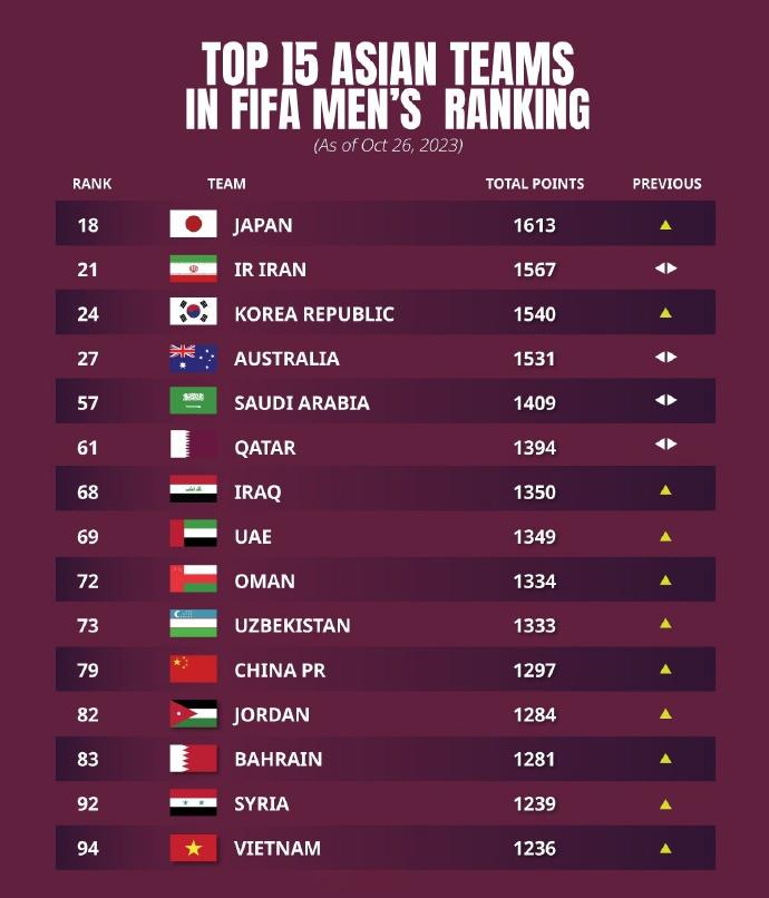 亚洲男足在国际足联的最新排名位置日本、伊朗、韩国...丢失的一角 @懂球帝2023-10-27 06:36亚洲男足在国际足联的最新排名位置 日本、伊朗、韩国前三 国足最新世界排名世界第79,亚洲第11位。展开更多