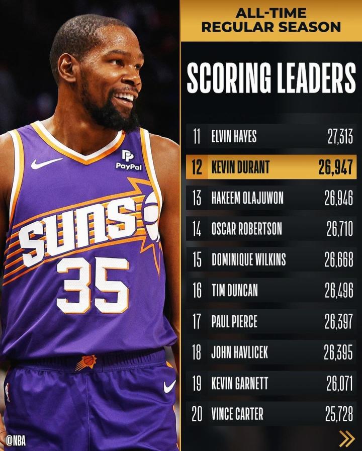今天结束的NBA常规赛第第二轮,太阳客场95-100不敌湖人,杜兰特砍下39分11篮板2助攻,生涯总得分超越奥拉朱旺,来到NBA历史得分榜的第12位。