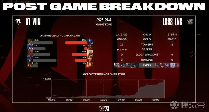 第32分钟,KT高地前击杀LNG四人后拆掉水晶扳平比分。