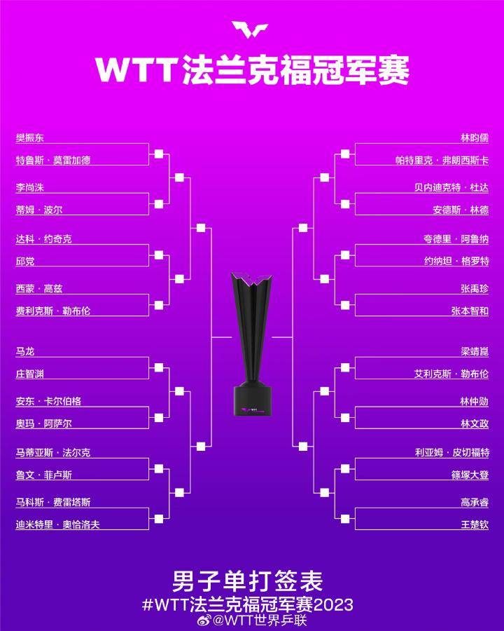 北京时间10月28日,2023年WTT法兰克福冠军赛抽签结果出炉。