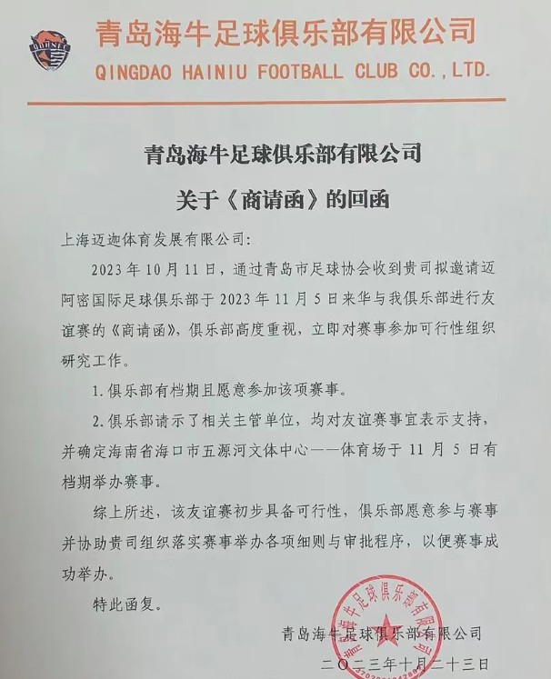 到了24日,网传一份青岛海牛俱乐部的官方回函显示,梅西中国行首战11月5日可能改在海口进行。