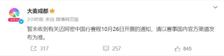 可作为票务合作方的大麦成都,下午就发布公告表示:“暂未收到有关迈阿密中国行赛程10月26日开票的通知”。可谓是上演了光速打脸。之所以大麦方面着急发布“辟谣公告”,也是因为在迈阿密方面官宣后,国内引发了巨大关注所致。