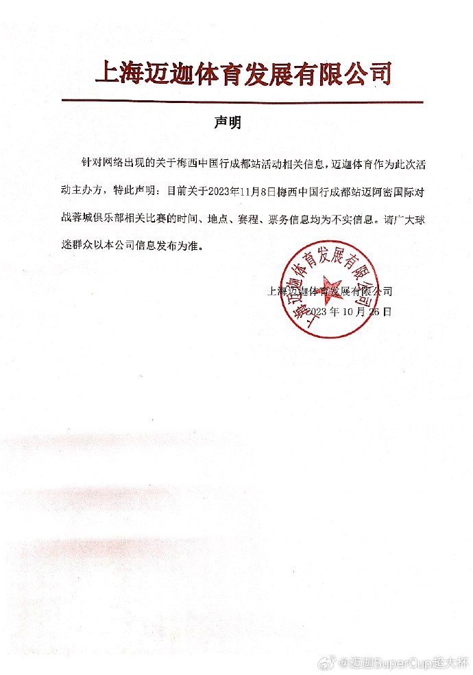 声明中写道:“针对网络出现的关于梅西中国行成都站活动相关信息,迈迦体育作为此次活动主办方,特此声明:目前关于2023年11月8日梅西中国行成都站迈阿密国际对战蓉城俱乐部相关比赛的时间、地点、赛程、票务信息均为不实信息,请广大球迷群众以本公司信息发布为准。”