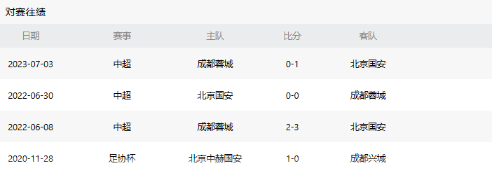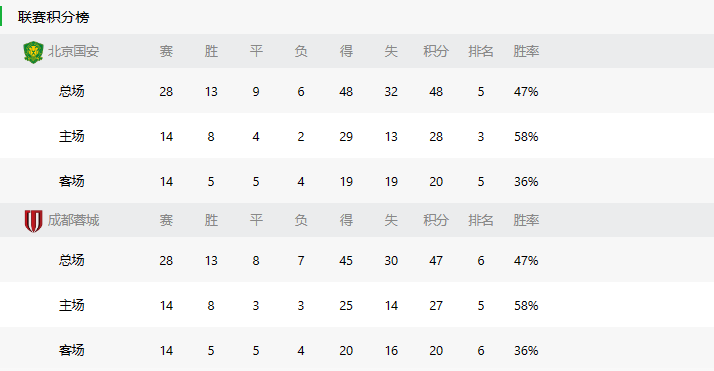 目前,成都蓉城积47分排名第六,北京国安队积48分排名第五,两队仅相差1分,本场比赛对双方都至关重要,将直接决定是否还有机会冲击亚冠,输球的一方基本无缘亚冠资格,谁都不会提前放弃。本赛季首回合交手,成都蓉城在主场0:1不敌对手。本轮比赛,面对强大的对手,又是客场作战,成都蓉城唯有放手一搏,方能全取3分。