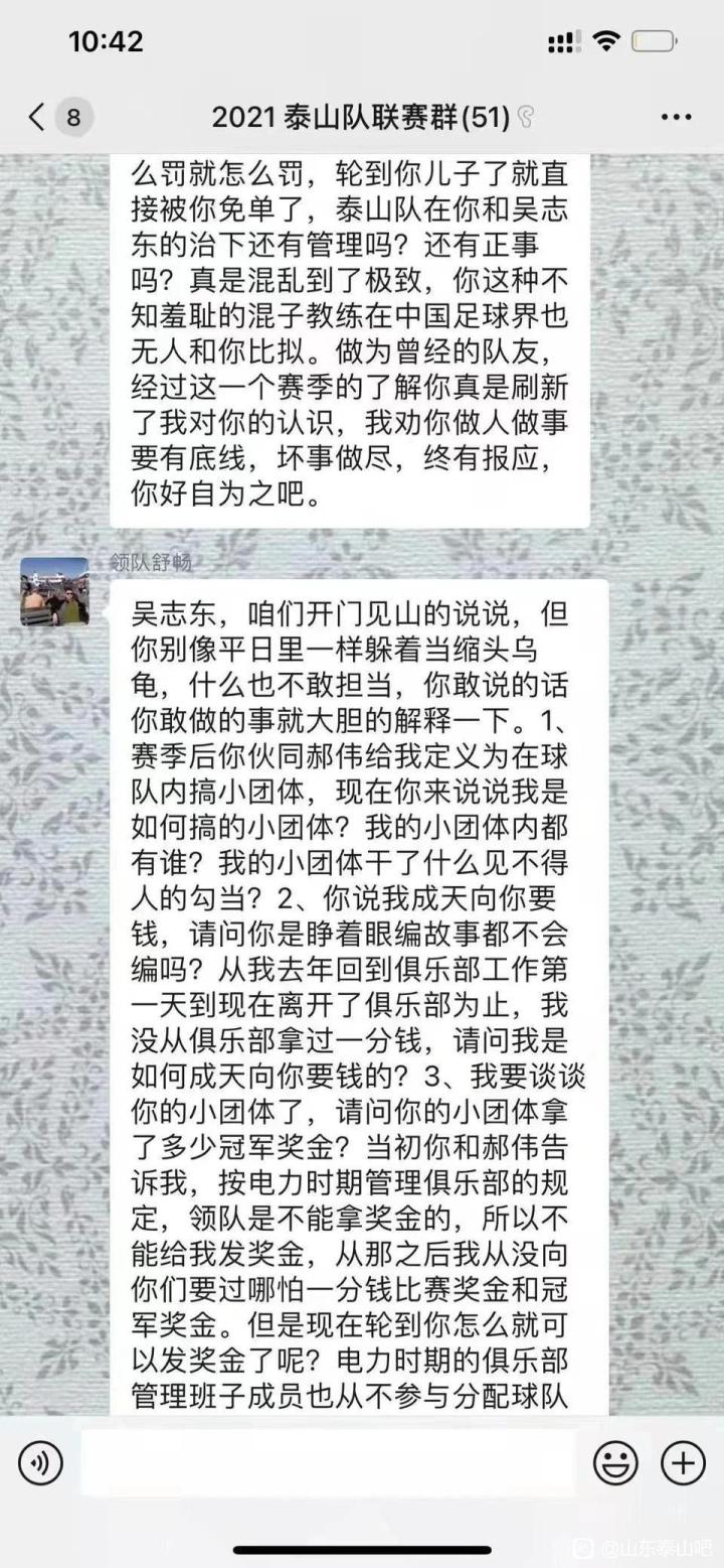 22年5月份,几张微信聊天截图在网上流出,前泰山领队舒畅在球队联赛群聊中公开炮轰球队主帅郝伟和俱乐部董事长吴志东。