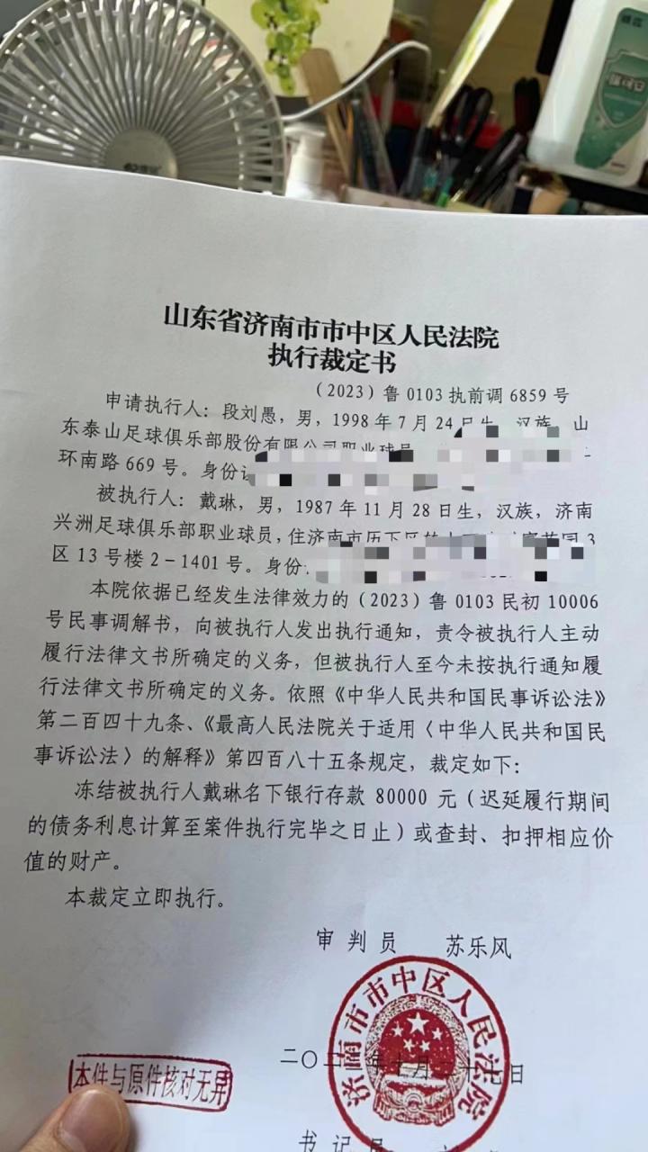 这份《山东省济南市市中区人民法院执行裁定书》中写道,申请执行人段刘愚,出生于1998年7月24日,是山东泰山足球俱乐部股份有限公司职业球员;被执行人戴琳,出生于1987年11月28日,是济南兴洲足球俱乐部职业球员。