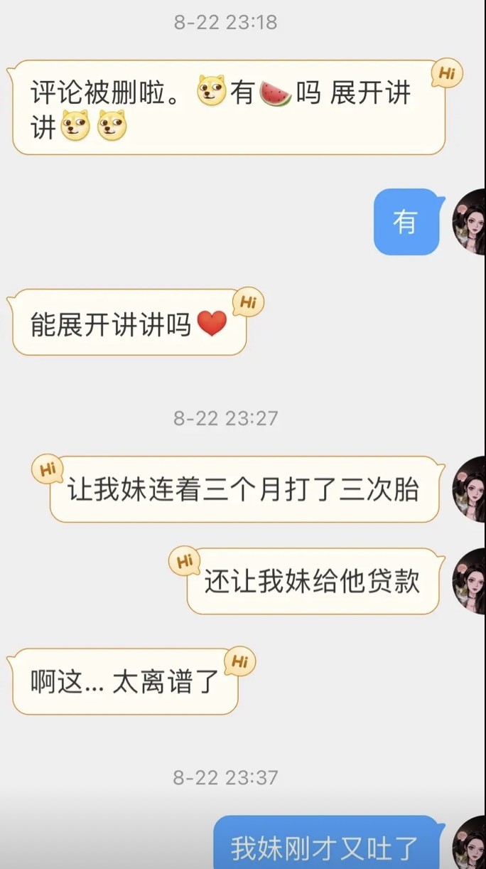 “第三次流产了,他还在给别的女孩子买奶茶开心。请体谅下我好嘛,为人父母谁能看到自己孩子被这样欺负,我好绝望。”“请别的女孩子吃东西,让我打胎自己垫钱,这是您儿子的做法。”