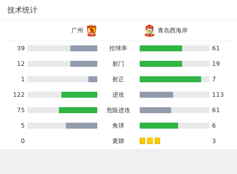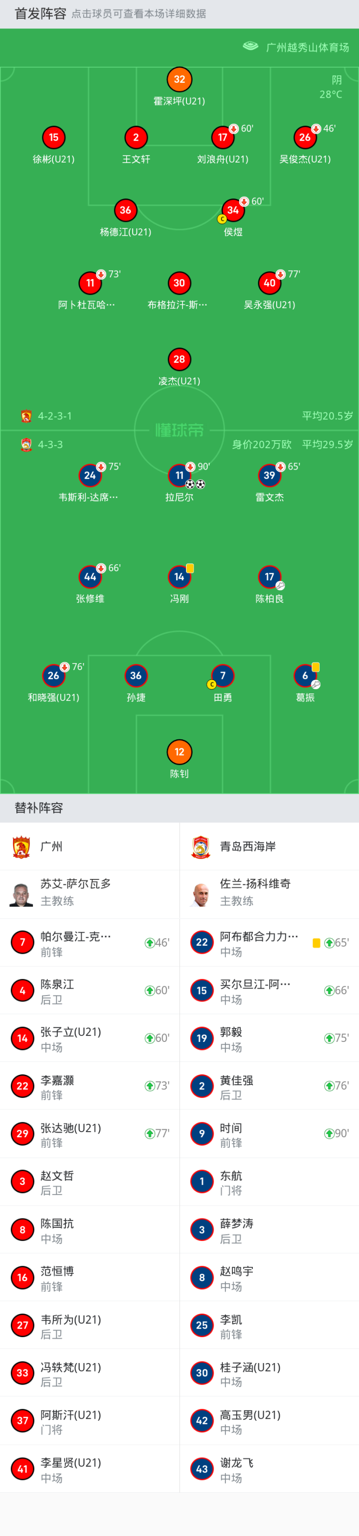 青岛西海岸首发:17-陈柏良, 36-孙捷, 14-冯刚, 6-葛振, 11-拉尼尔, 44-张修维, 24-韦斯利-达席尔瓦, 39-雷文杰, 7-田勇, 12-陈钊, 26-和晓强(U21)