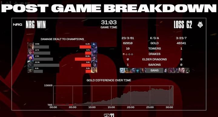 电竞赛事战报2023英雄联盟全球总决赛瑞士轮NRG vs G2,NRG 2-0 G2,NGR两局碾压进入八强。