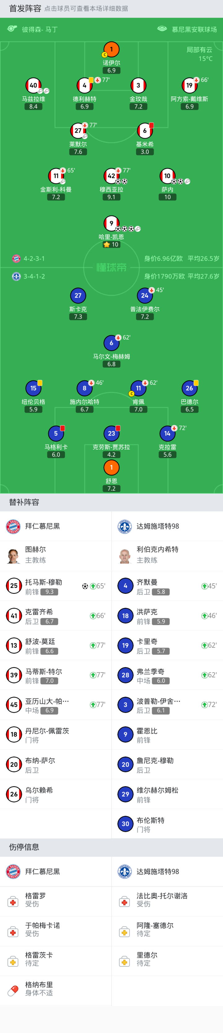 上场替补:77'13-舒波-莫廷, 65'25-托马斯-穆勒, 77'39-马蒂斯-特尔, 66'41-克雷齐希, 77'45-亚历山大-帕夫洛维奇