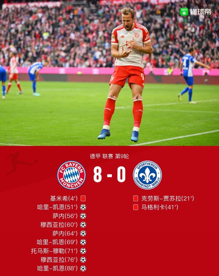 北京时间10月28日21:30,德甲联赛第9轮,拜仁慕尼黑主场对阵达姆施塔特98。上半场,基米希开场四分钟染红离场,客队贾苏拉、马格利卡同样吃到直红被罚下;下半场,拜仁展开猛烈攻势,凯恩复刻贝克汉姆中圈吊射并完成帽子戏法,穆西亚拉、萨内梅开二度,穆勒取得进球。最终拜仁主场8-0血洗升班马。
