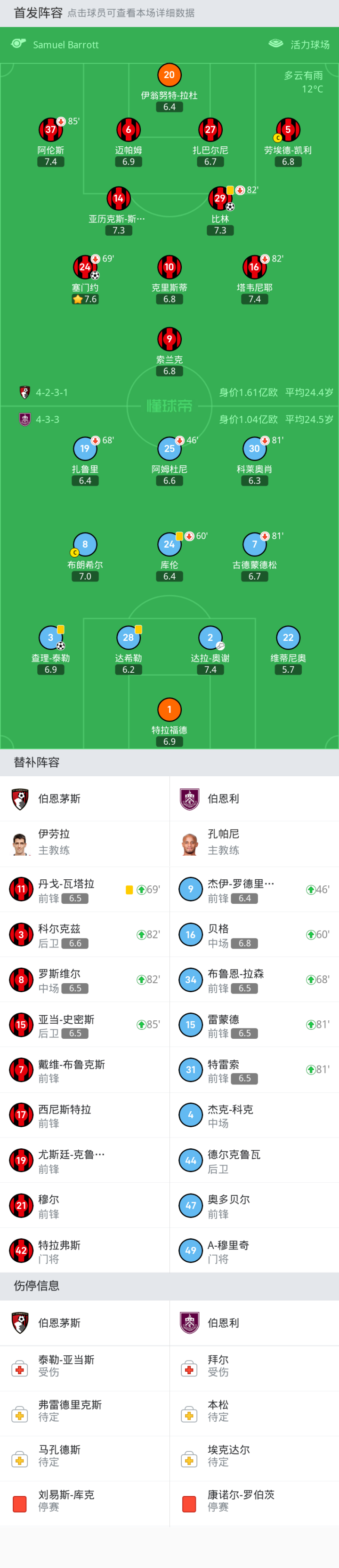 伯恩茅斯首发:10-克里斯蒂, 9-索兰克, 29-比林, 20-伊翁努特-拉杜, 16-塔韦尼耶, 37-阿伦斯, 5-劳埃德-凯利, 6-迈帕姆, 24-塞门约, 27-扎巴尔尼, 14-亚历克斯-斯科特
