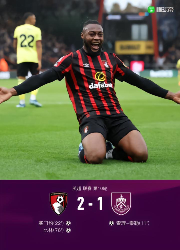 北京时间10月28日英超联赛第10轮,伯恩茅斯主场对阵伯恩利。比赛第11分钟,查理-泰勒率先破门,比赛第22分钟,塞门约一条龙破门扳平比分,比赛第76分钟,比林超远吊射破门。最终比分伯恩茅斯2-1伯恩利。