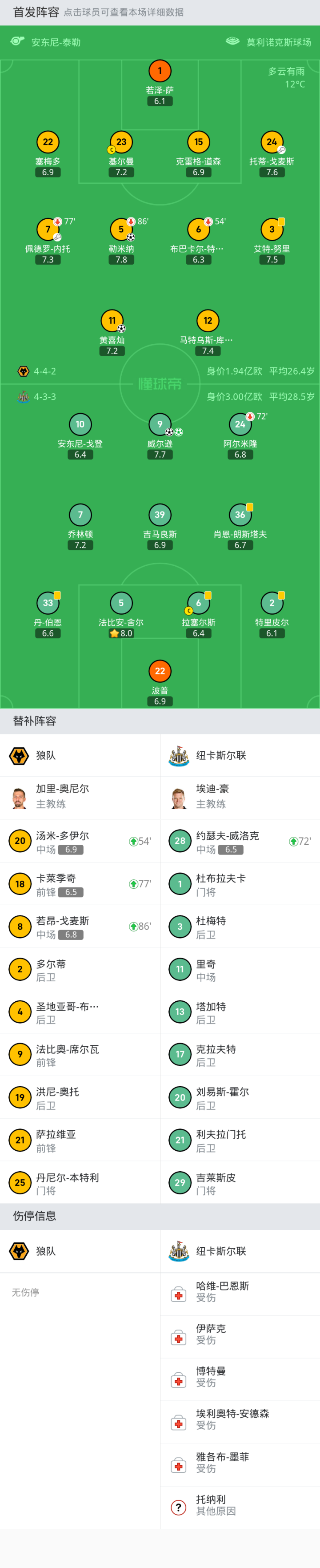 上场替补:77'18-卡莱季奇, 54'20-汤米-多伊尔, 86'8-若昂-戈麦斯