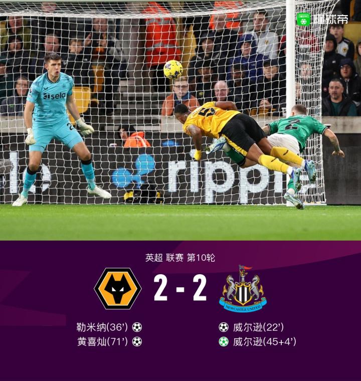 狼队2-2纽卡,黄喜灿破门,威尔逊梅开二度,内托伤退