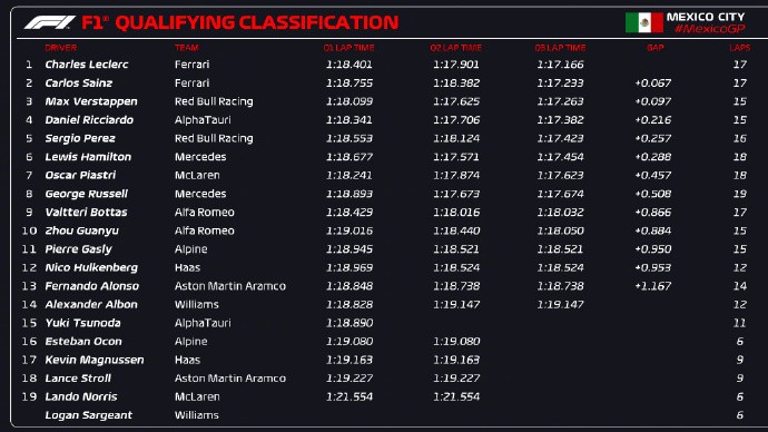 F1墨西哥城站排位赛:勒克莱尔拿杆位塞恩斯第二,周冠宇第10CaptainThanos @懂球帝2023-10-29 07:1610月29日凌晨,2023赛季F1墨西哥城大奖赛排位赛在墨西哥城进行,法拉利车队表现出色包揽头排发车。法拉利车手勒克莱尔拿到杆位,塞恩斯排名第二。维斯塔潘排名第三,里卡多位列第四。中国车手周冠宇排名第10。展开更多