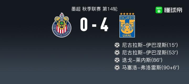 北京时间10月29日墨超 秋季联赛 第14轮,瓜达拉哈拉主场对阵墨西哥老虎。墨西哥老虎尼古拉斯-伊巴涅斯梅开二度,迭戈-莱内斯破门,马塞洛-弗洛雷斯破门。最终比分0-4。